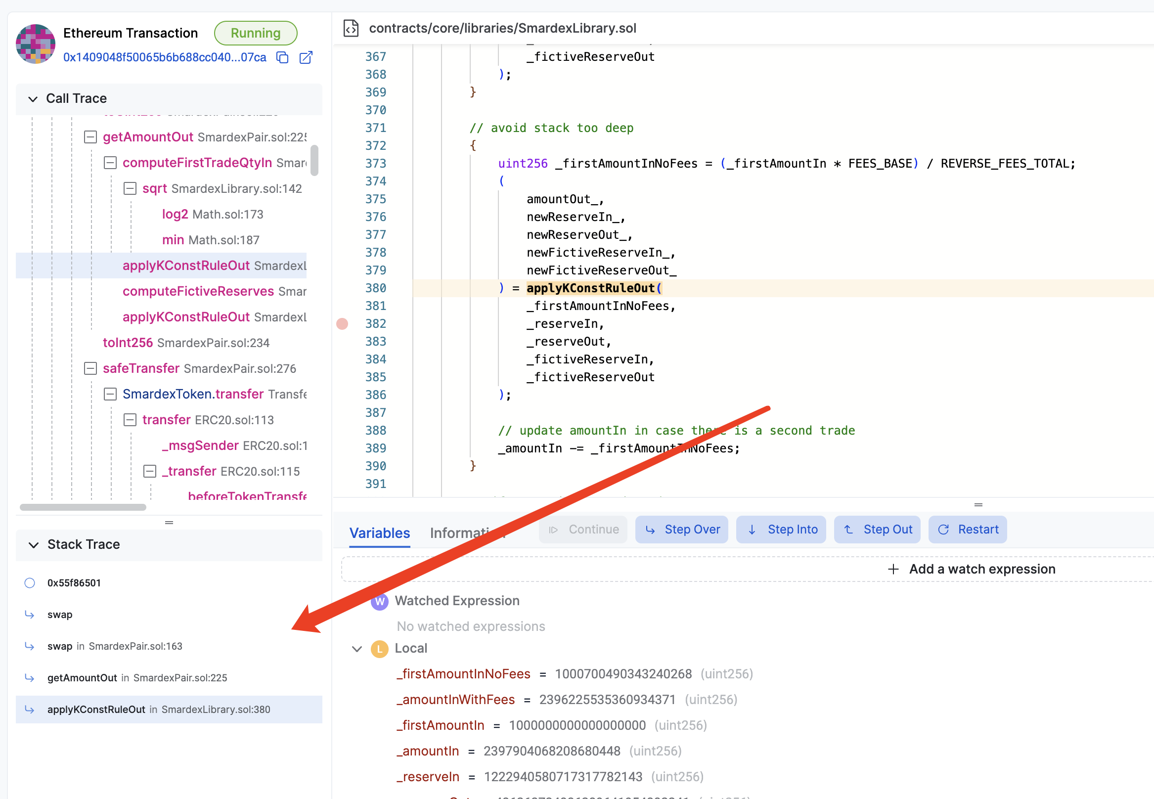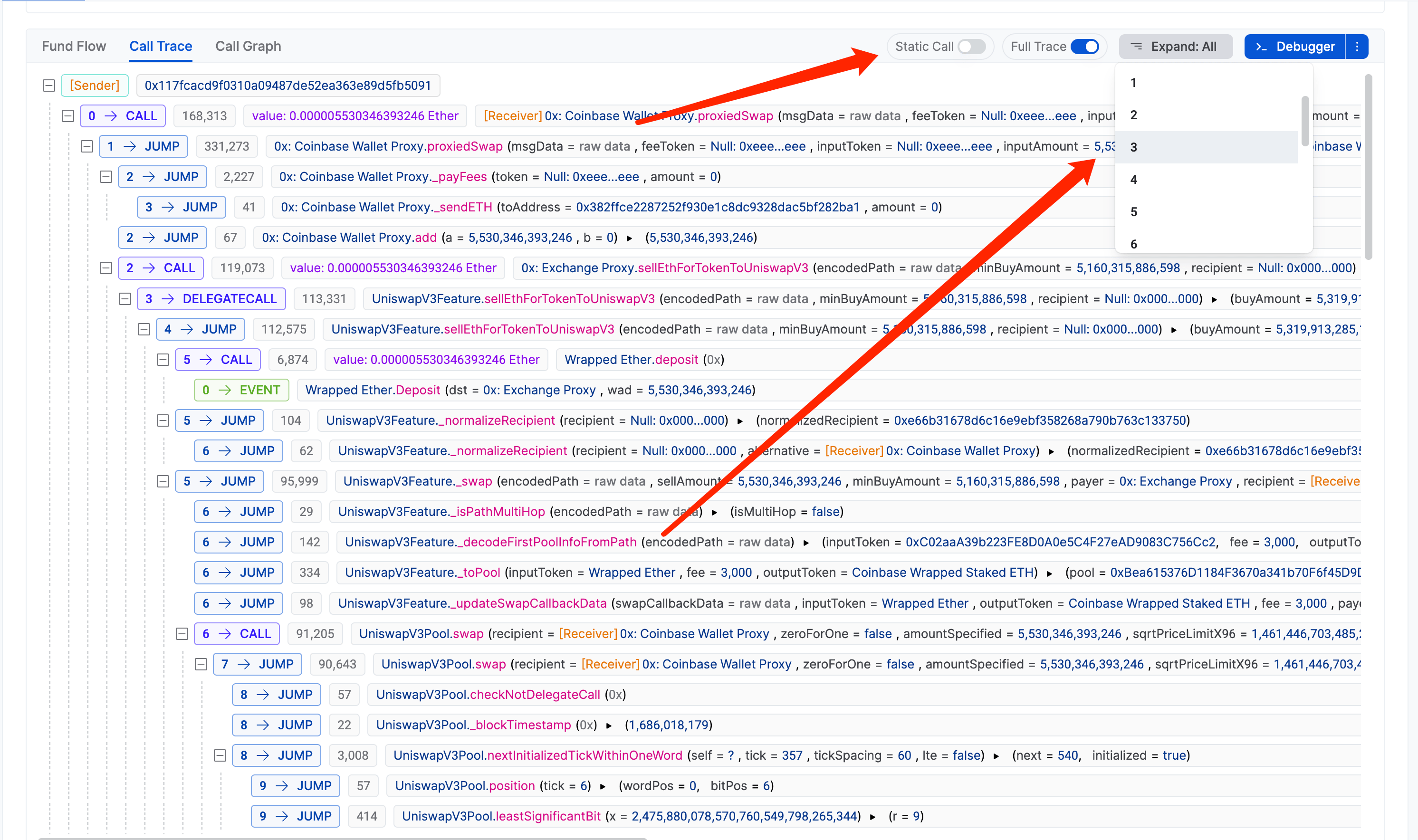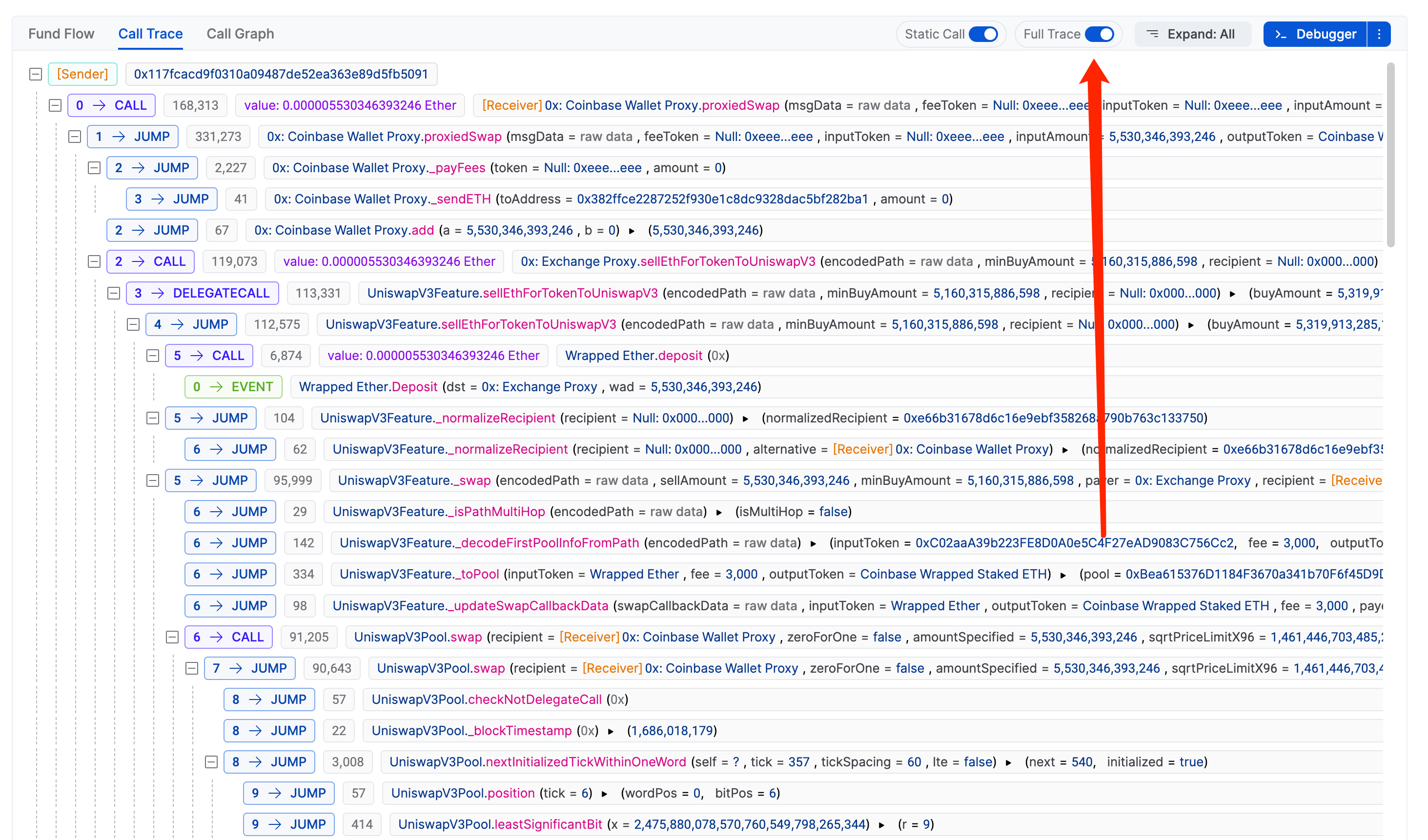 On the upper-left section, Sentio shows the trace of the transaction, this is the same as trace and call. Users can use this to select a location and execute directly to that position.