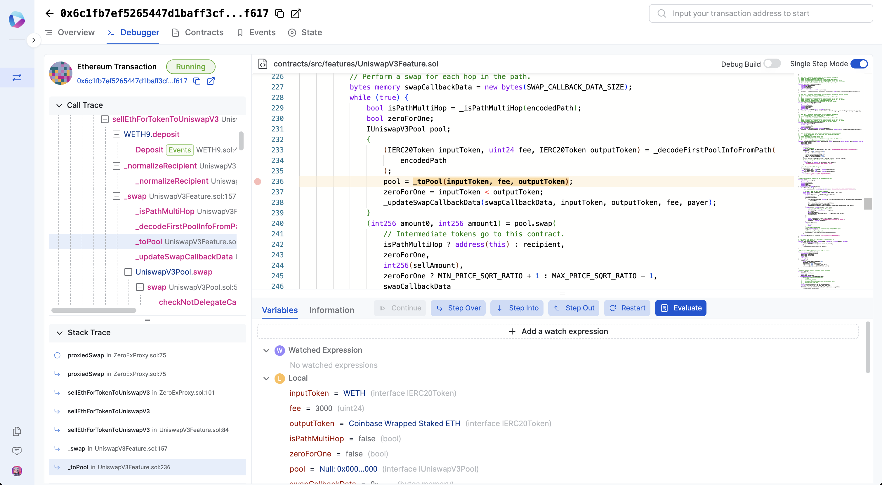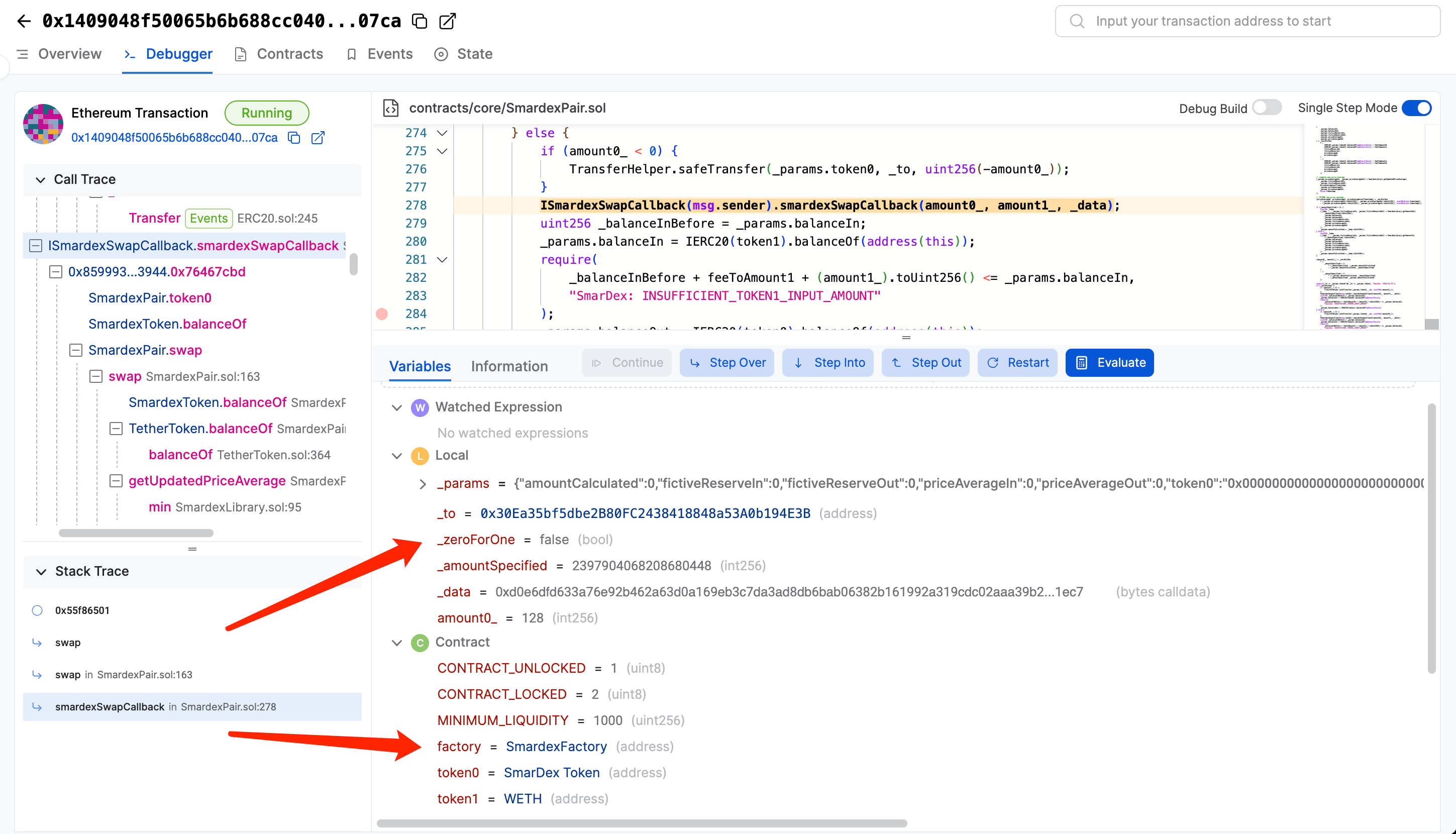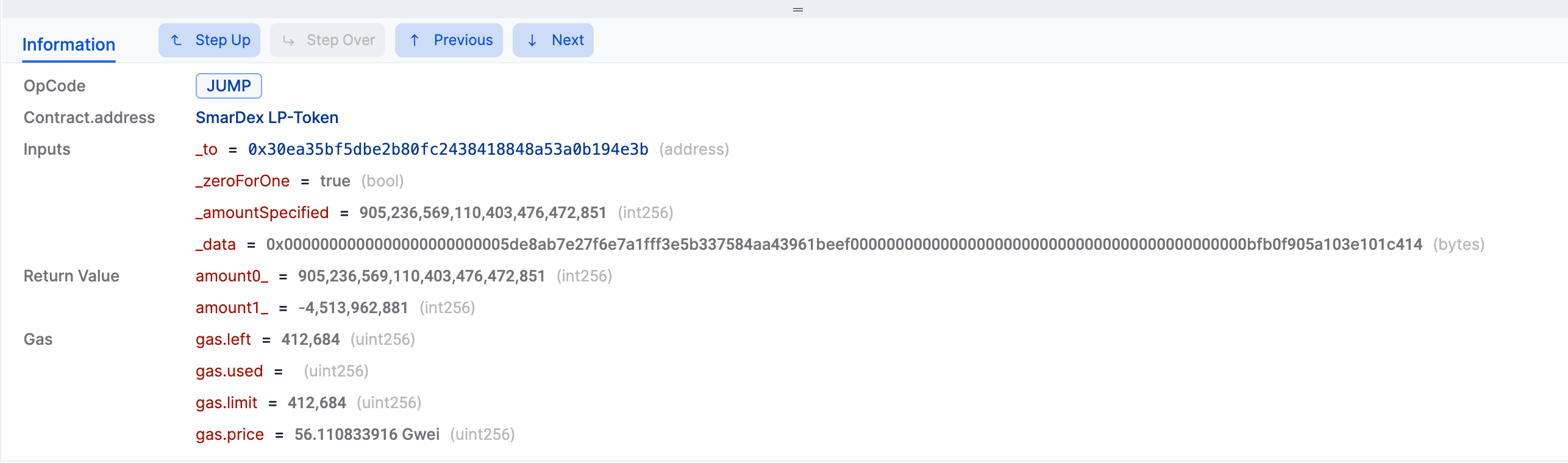 On the upper-left section, Sentio shows the trace of the transaction, this is the same as trace and call. Users can use this to select a location and execute directly to that position.