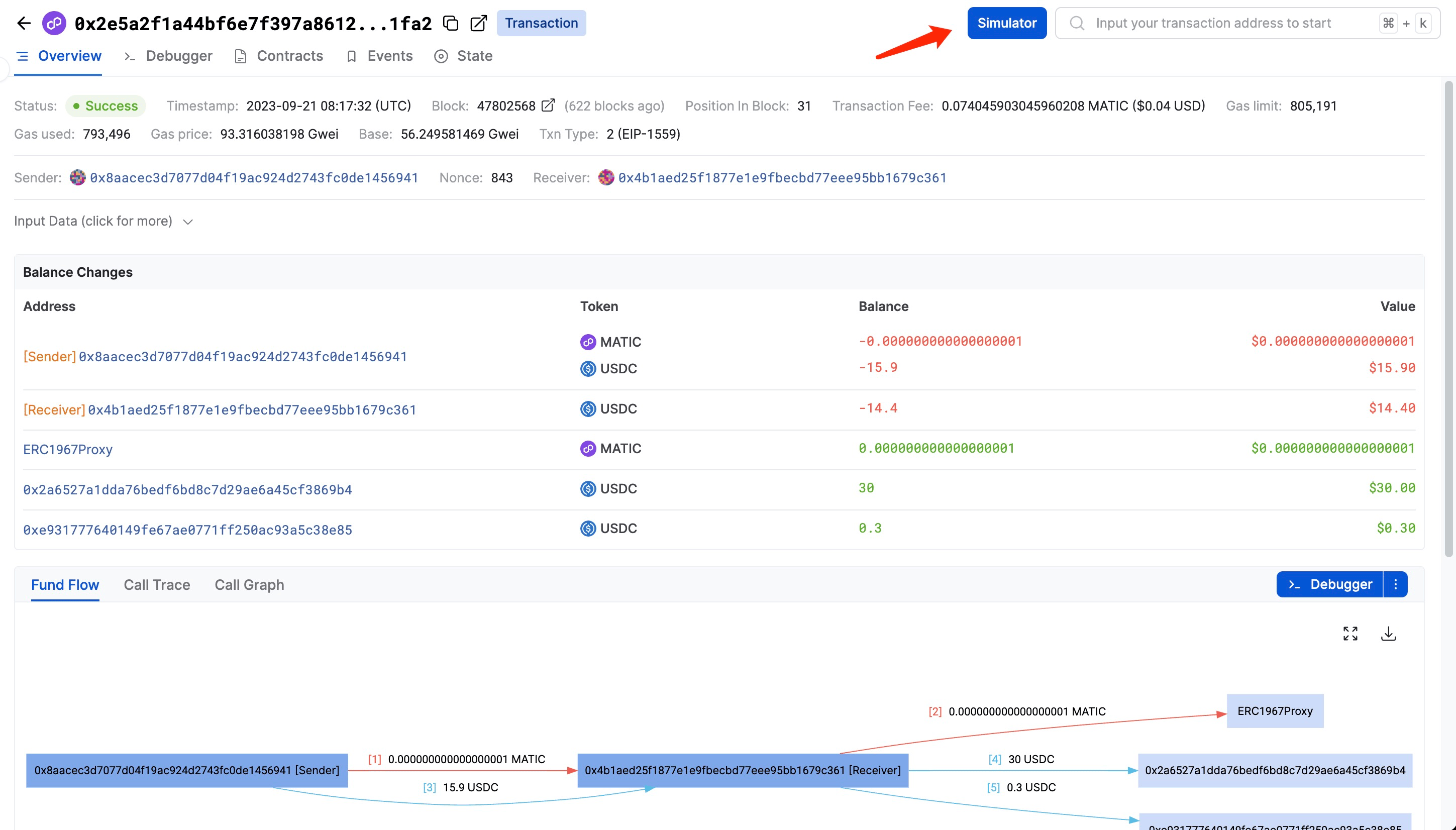 Click the simulate transaction button will save this run to the simulation history of your project and show you the result, just like what you see from the normal debugger UI.