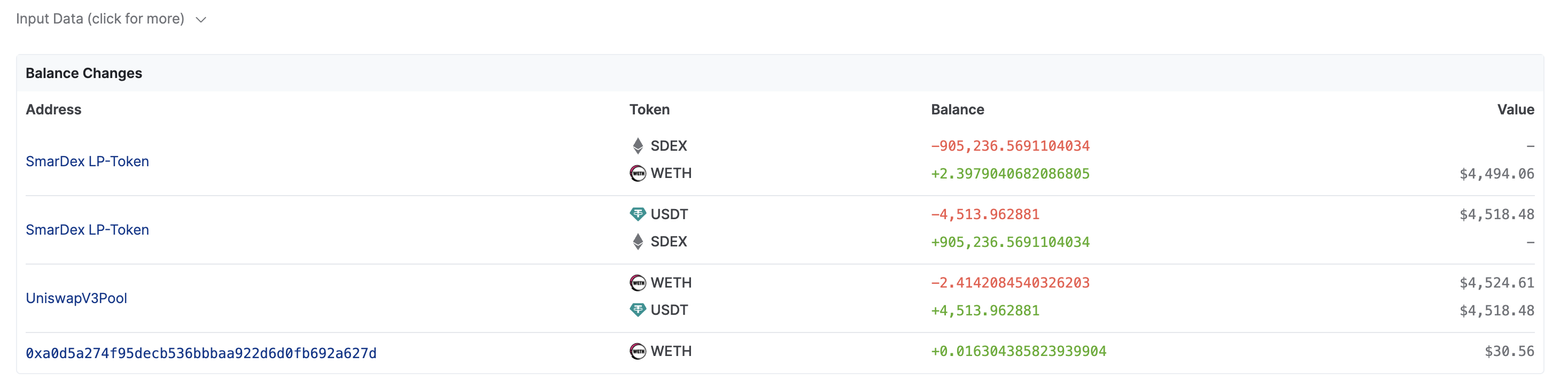 For example, in this MEV arbitrage transaction above, each party involved has a balance of different assets increasing and decreasing, except one address (0xa0d...) which has only an increasing asset, indicating that it made the arbitrage profit.