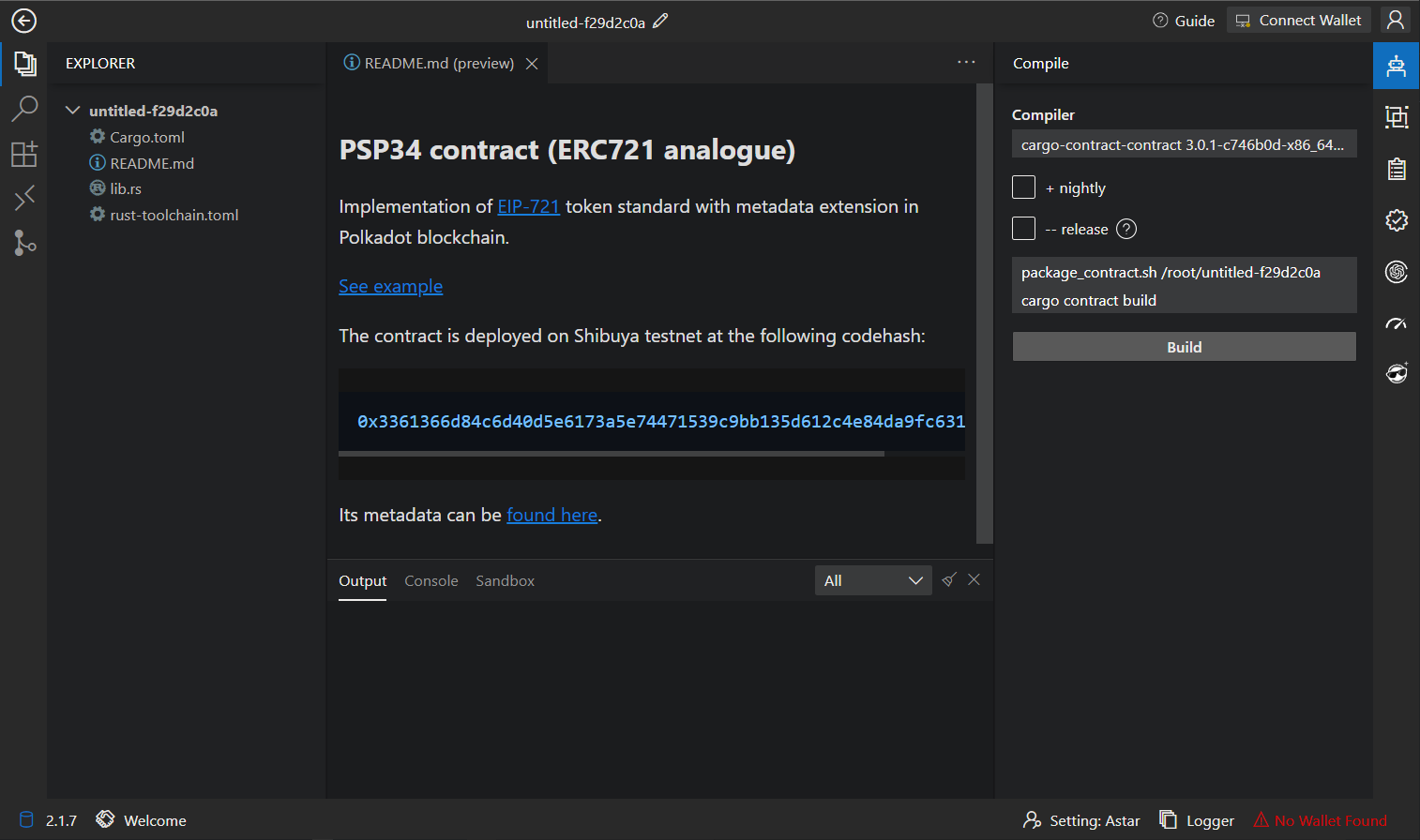 Before deploying the contract, you need to click on "Connect Wallet" in the upper right corner, choose your wallet, and use it to connect to the Astar blockchain.