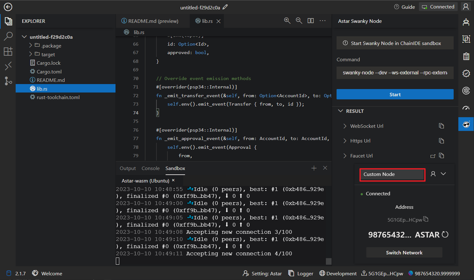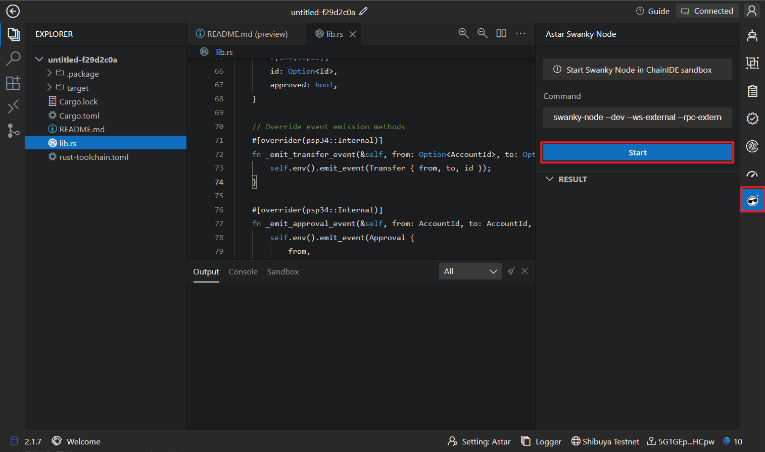 ChainIDE has integrated a graphical Swanky Node. Click on "Astar Swanky Node" on the right-hand side and then click "Start."