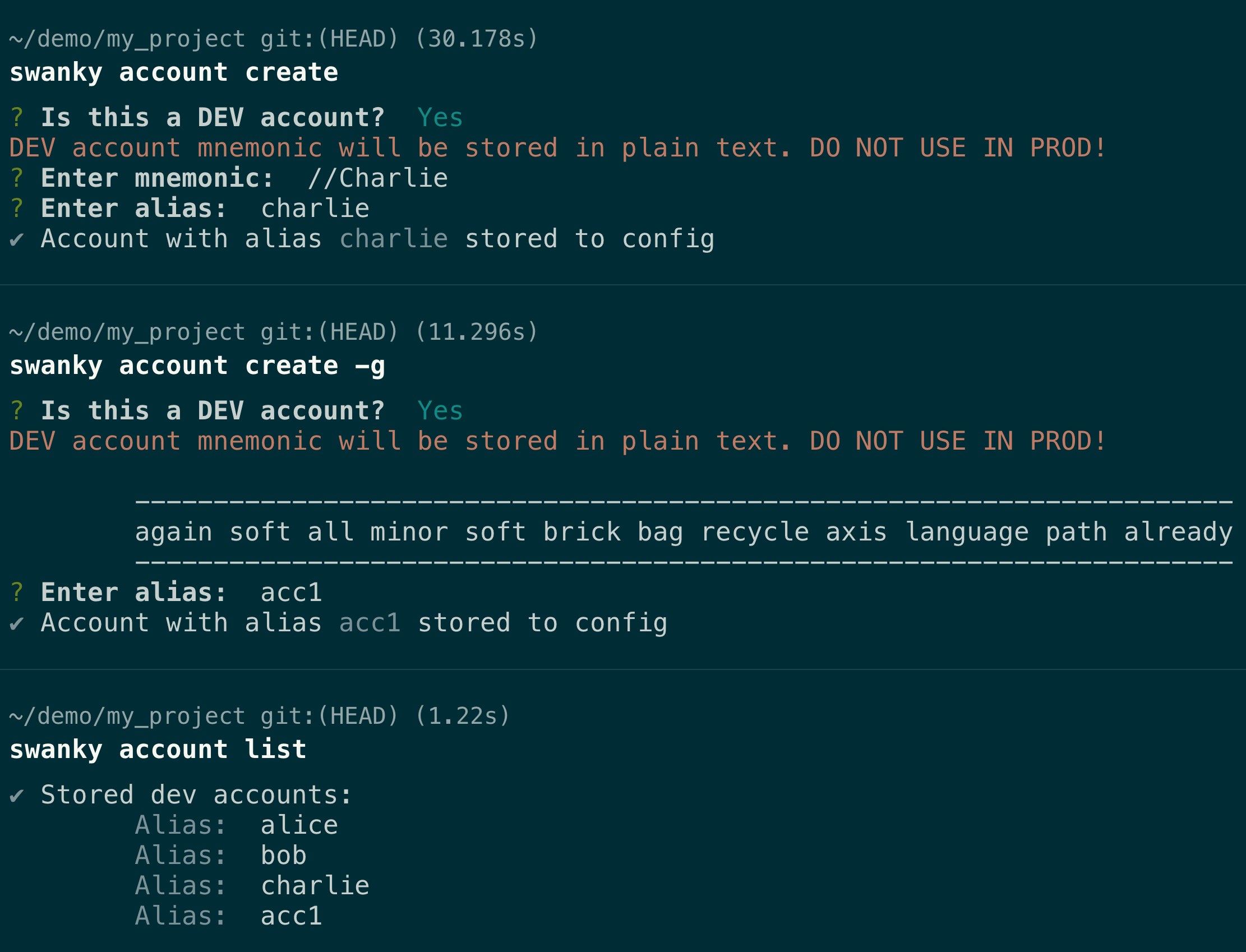 Be careful not to use a dev account on live networks, as their mnemonic is stored in plain text in the config!