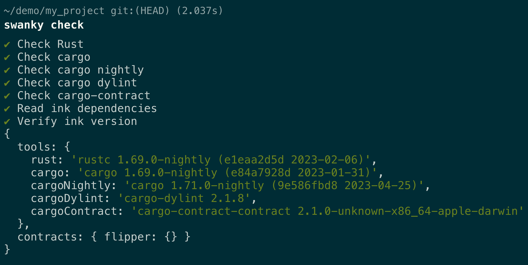 Swanky CLI is a Node.js based CLI application that abstracts away and extends the functionality of Polkadot.js, cargo contract, and other ink! based smart contract developer tools.
