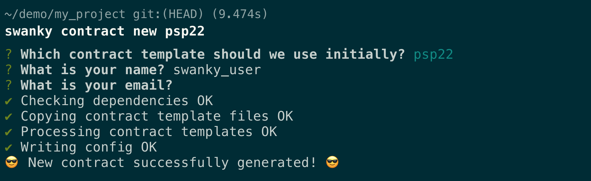 Using the swanky init command, you'll be prompted for a series of answers to define your project and the first smart contract within it.