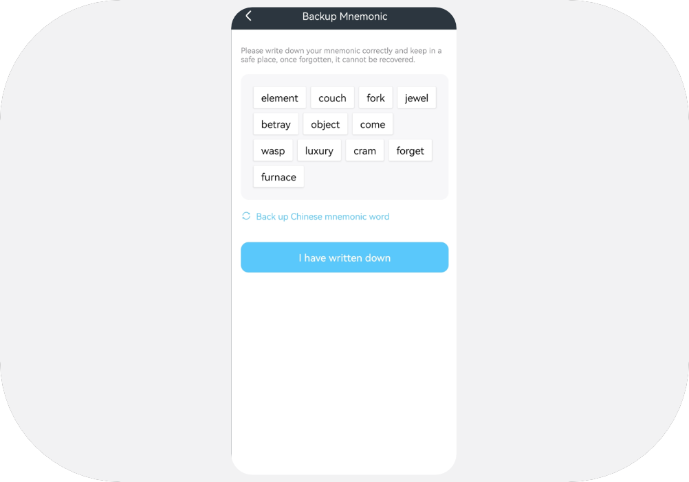 - Write down the 12-word seed phrase and store it in a safe and secure place;