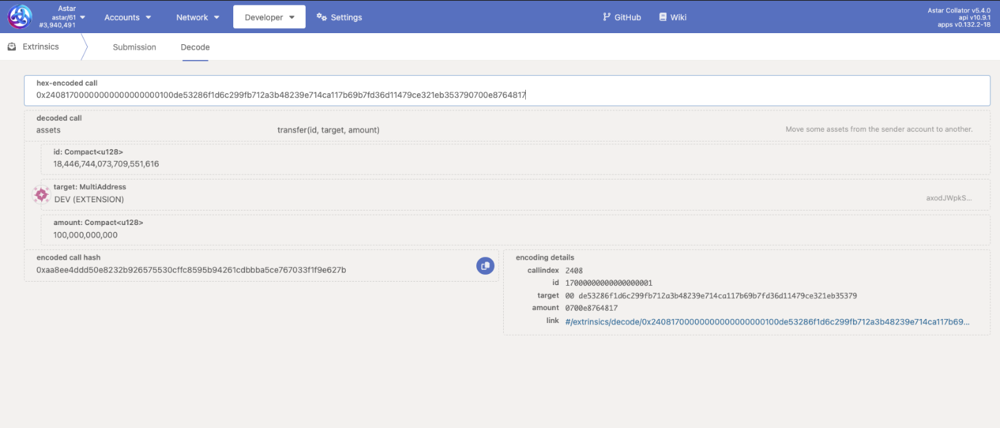 Call Dataand paste it on the Decode page on the Polkadot.js portal.