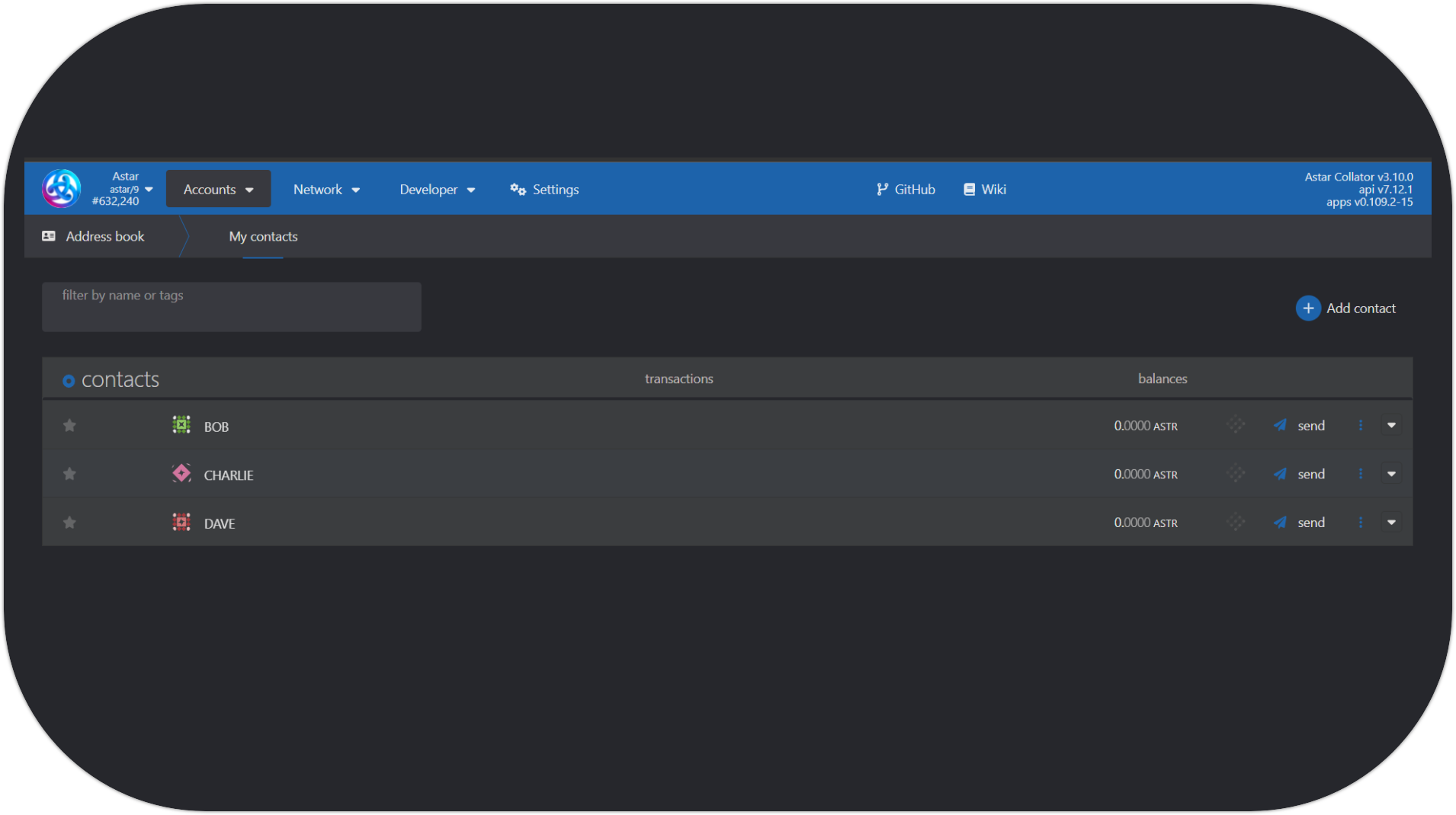 + Add Contactand add all the contact addresses that you want to include in the multisig wallet; - For example; Bob, Charlie and Dave.