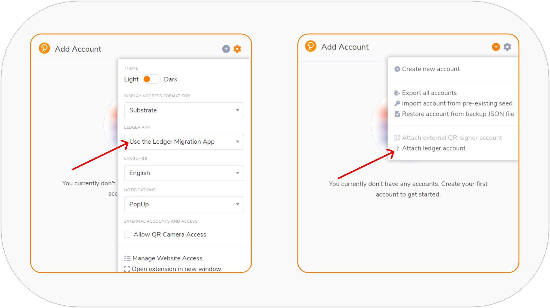 Use the Ledger Migration Appin Ledger App setting; - Click on Attach Ledger account as shown below;