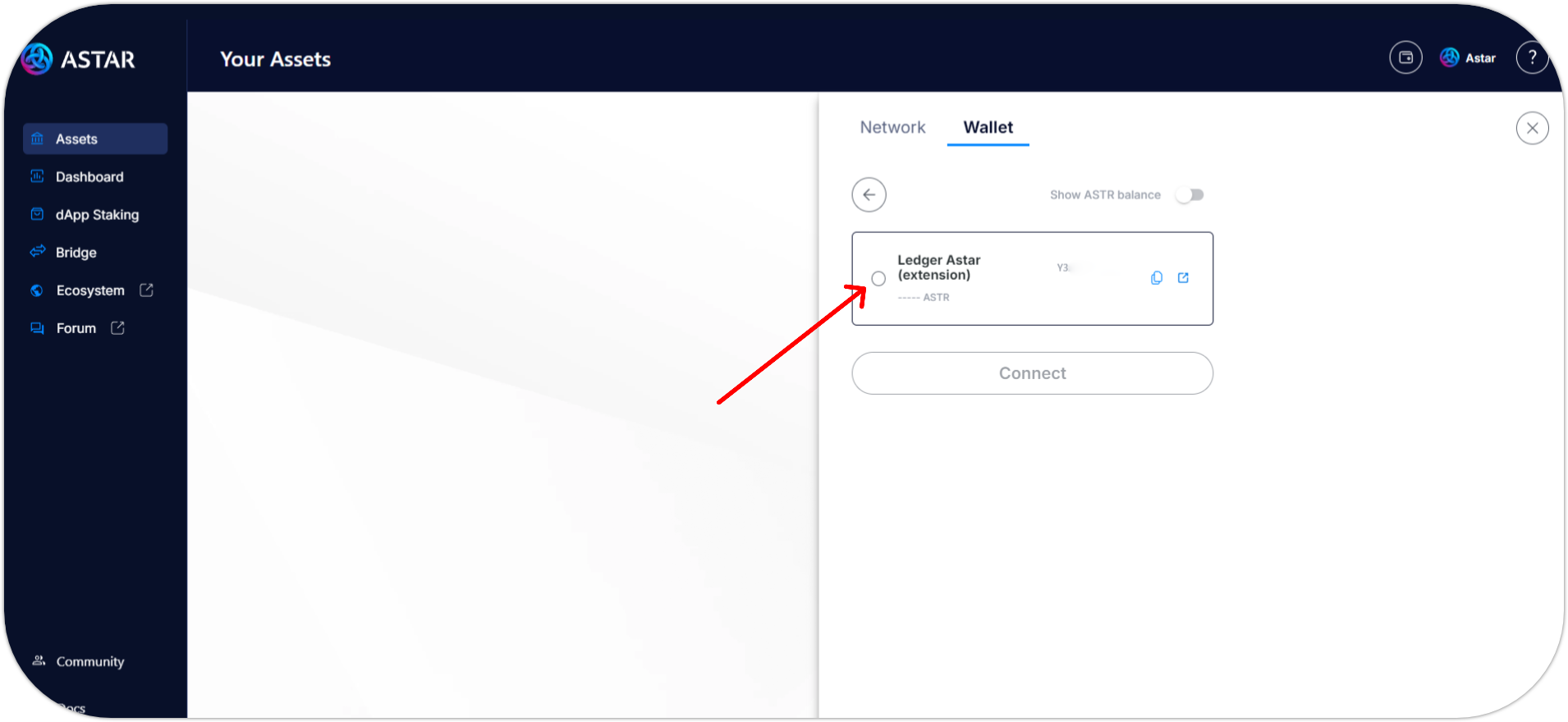 If you can't see your wallet, open the Polkadot.js extension settings and allow the wallet to manage the Astar portal.