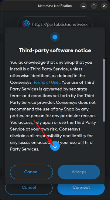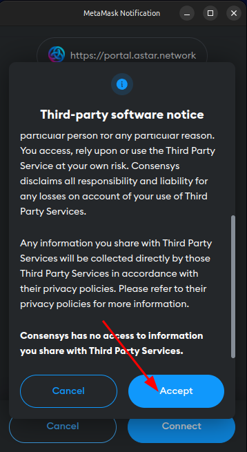 Click the arrow to view the entire third-party software notice and, if you accept it, click the MetaMask "Third-party software notice" button labeled "Accept" to accept the MetaMask third-party software notice.