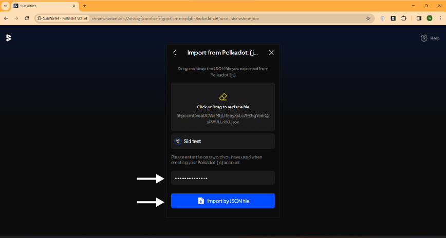You can import a Polkadot.js account after exporting the JSON backup file. Click on the Import from Polkadot.js field to upload a file from your device, or drag and drop your JSON file into the field.