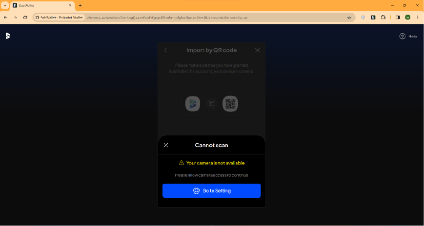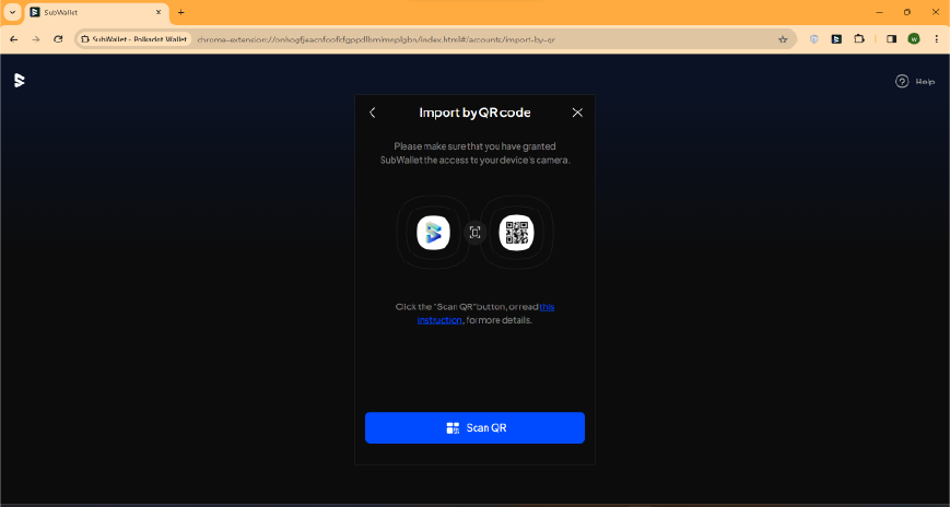 On the settings page, toggle on Camera access for QR then head back to the QR page, click on Scan QR and scan your accounts' QR code. After the successful import of your account by QR code, you will be directed to the Homepage.
