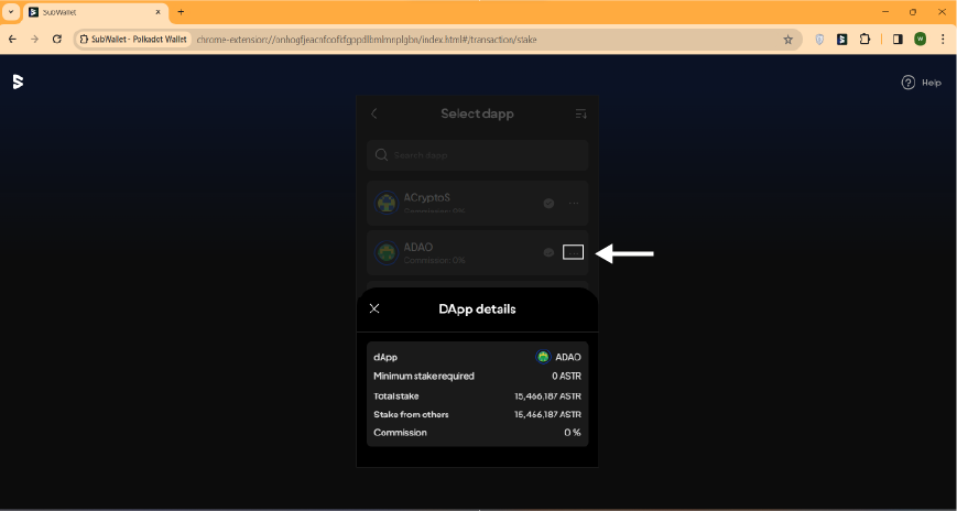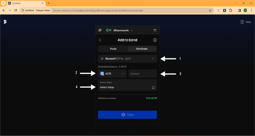 - Enter the amount of tokens. The minimum active for dApp staking with ASTR is 500 ASTR.