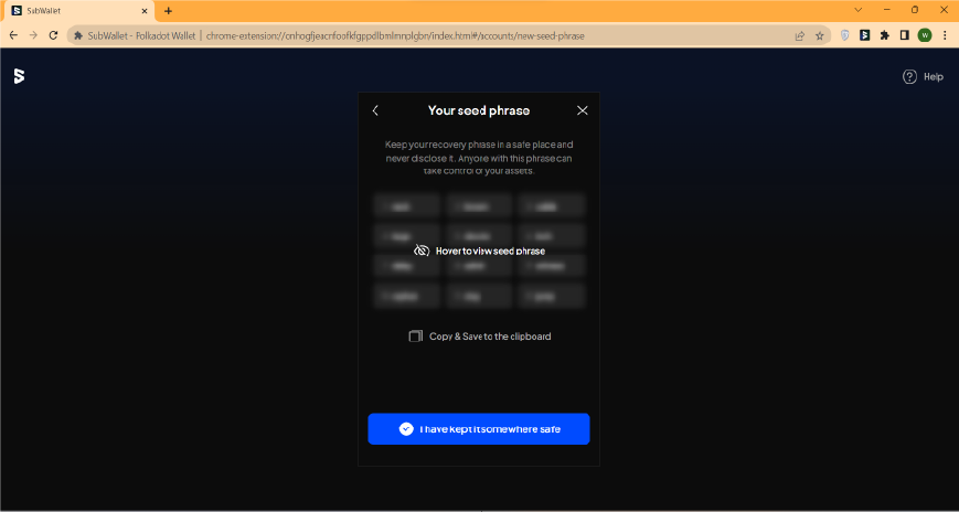 Now you will be shown a seed phrase together with the option to back it up. Once you have saved and stored it in a safe place, choose I have kept it somewhere safe.