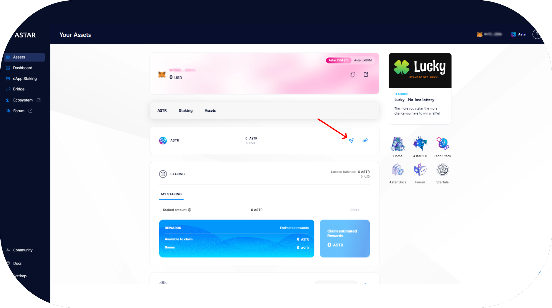 Most projects on Astar Network are deployed on Astar EVM, so you'll need to transfer your ASTR tokens and other assets from Astar Substrate to Astar EVM if you want to interact with these dApps.
