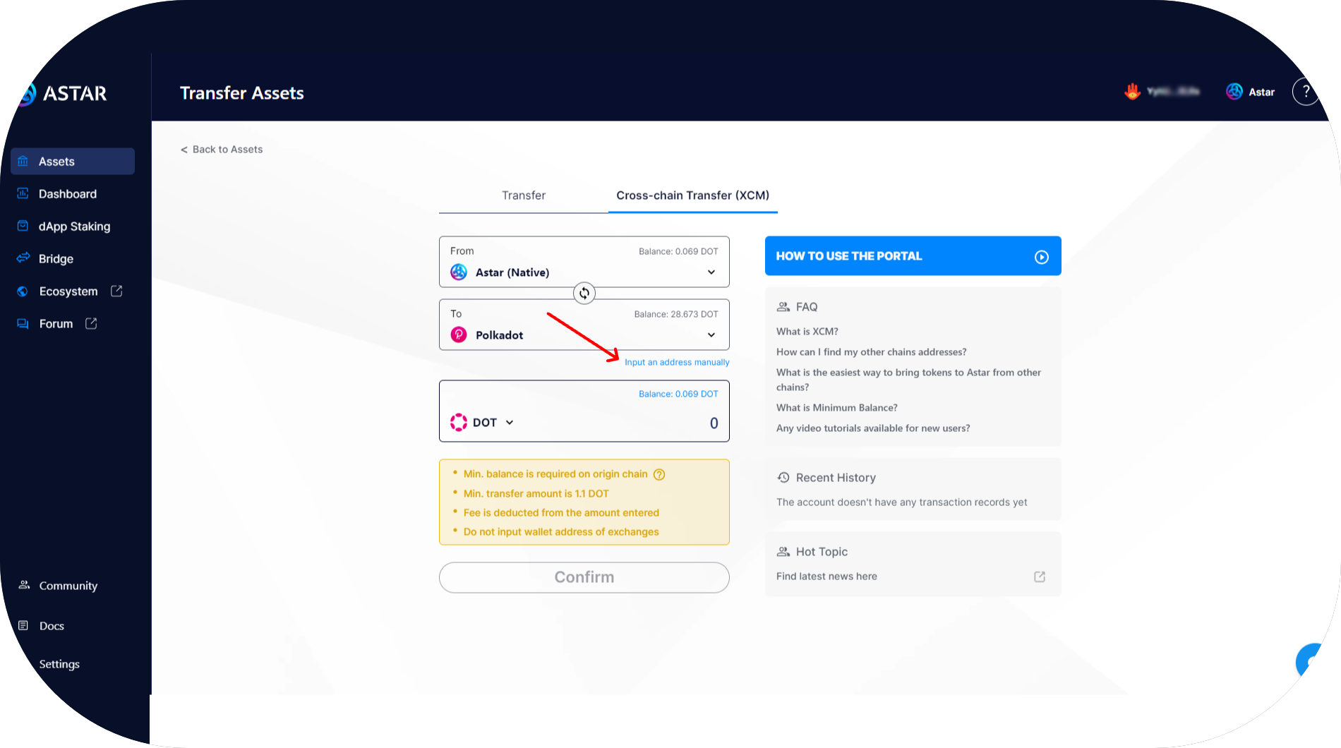 - You are now on the transfer page. Enter your Astar EVM address and the amount you want to transfer, then press