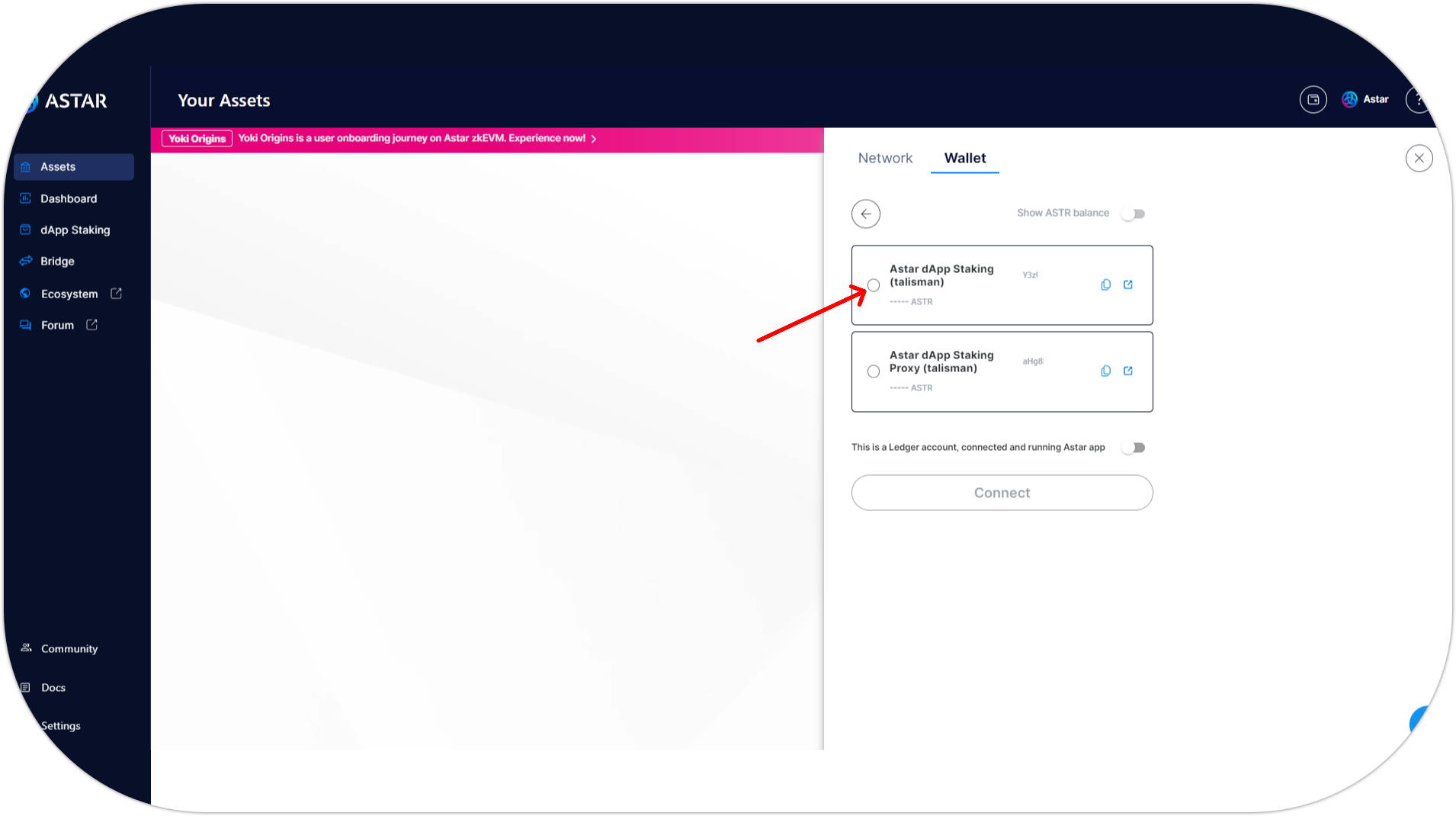 - Choose a wallet provider (Polkadot{.js}, Talisman, Subwallet, Nova Wallet, etc.) and select the Astar substrate account you want to connect;